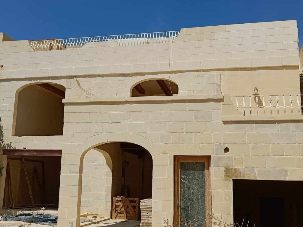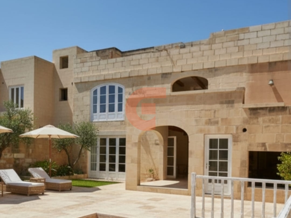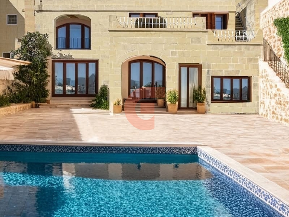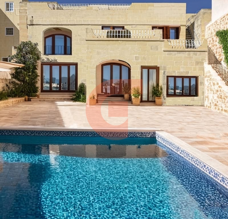 SEMI-FINISHED 400-year-old beautiful farmhouse in UCA, suitable also for B&B. Including 9 bedrooms (all with en-suites) and a massive kitchen, living area, extra 2 large rooms for a Jacuzzi area and games room. South-facing 11x5.5m pool in 250sqm outdoor space. Huge terraces overlooking the pool area. Beautiful Gozo views from the top 9m frontage penthouse. Can be 3 independent units with a shared pool.  Permits for the garage. All apertures are available, including outdoor travertine tiles, and much more work has already been carried out. Plot of around 450sqm.